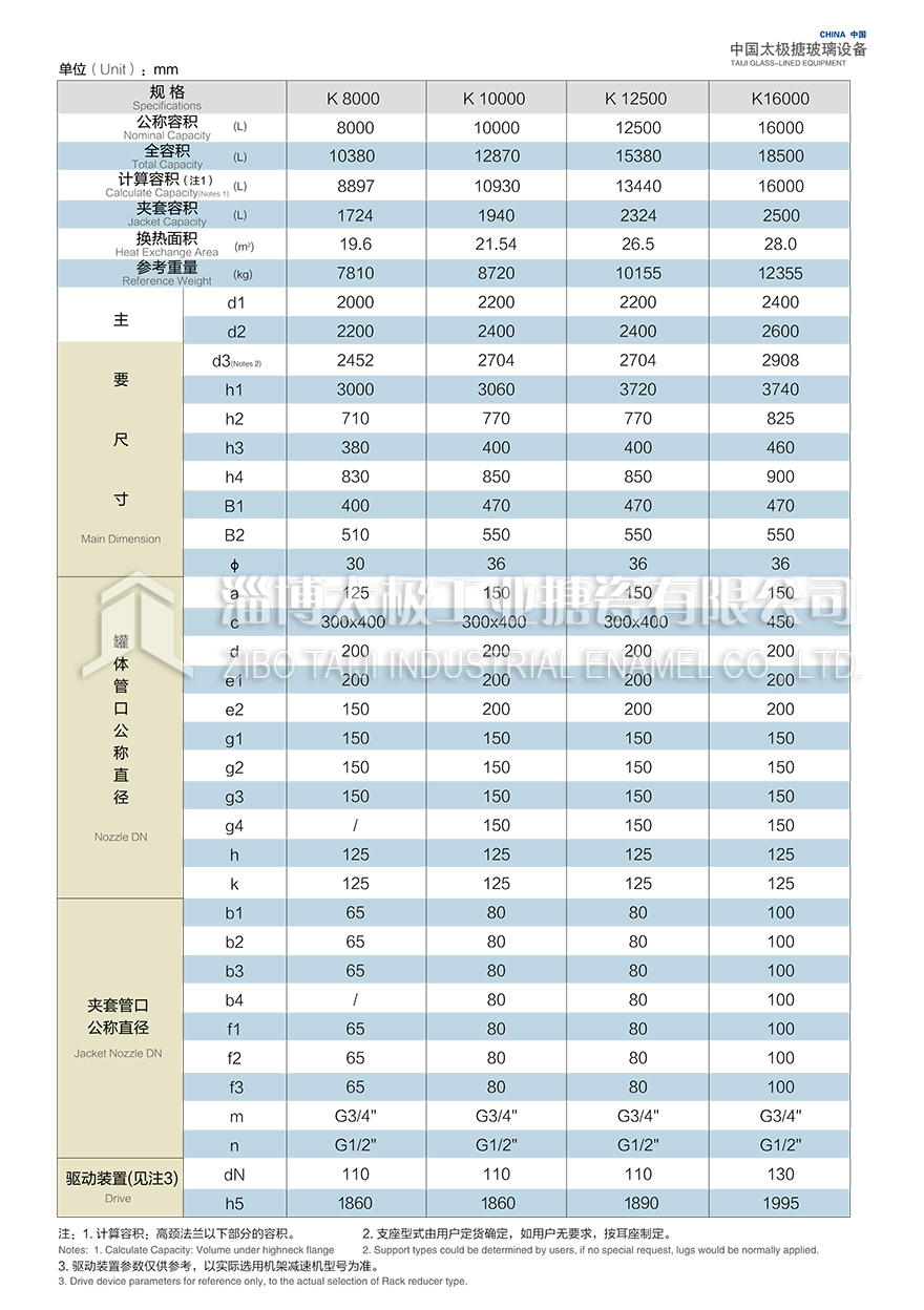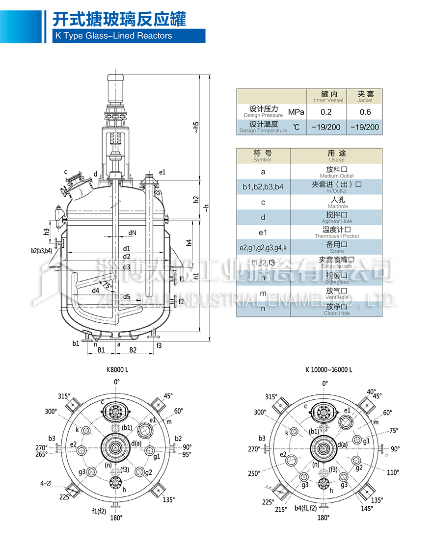 K8000L~K16000L開式搪玻璃反應(yīng)釜(搪瓷反應(yīng)釜)設(shè)計圖紙及相關(guān)參數(shù)如下所示:
