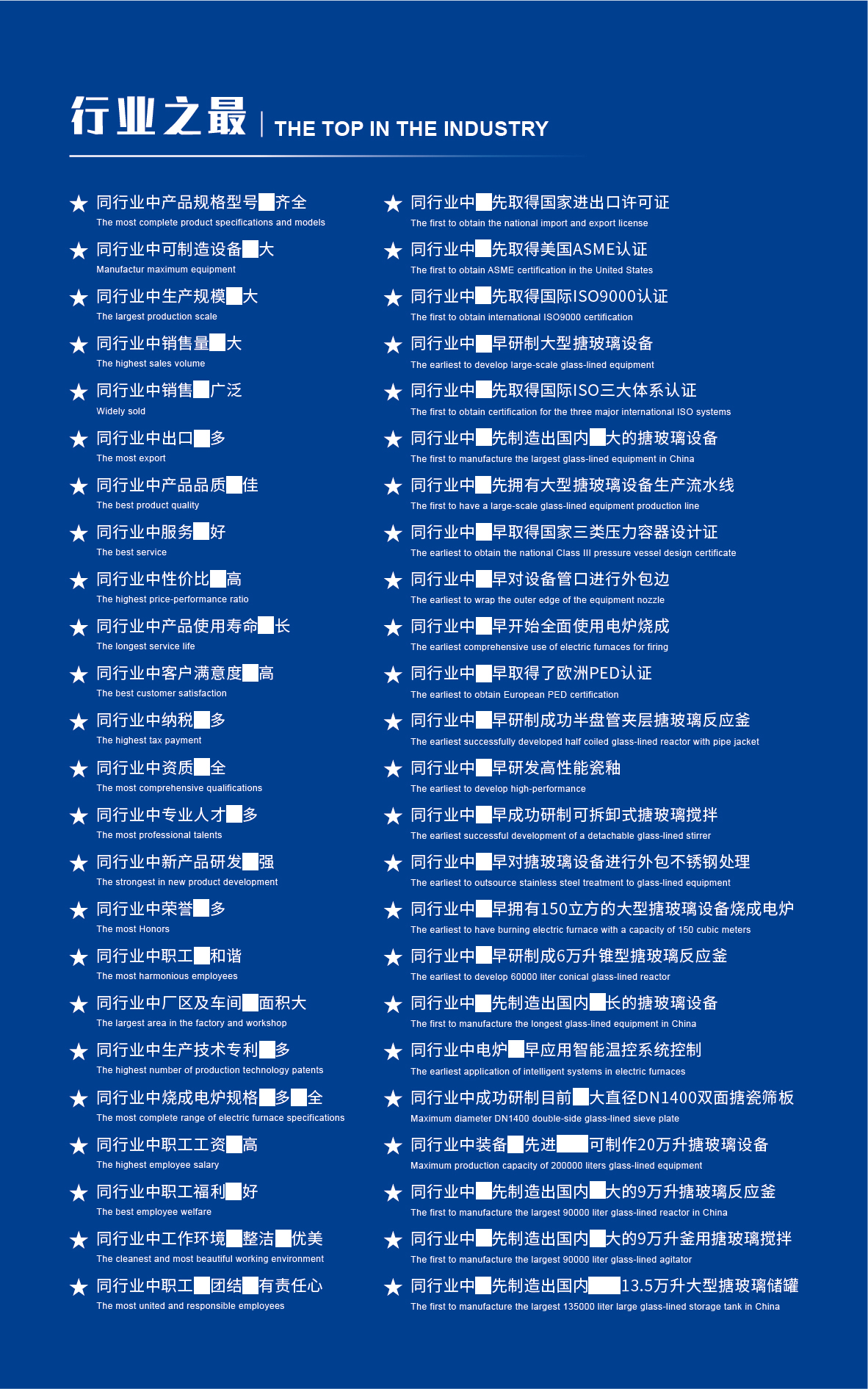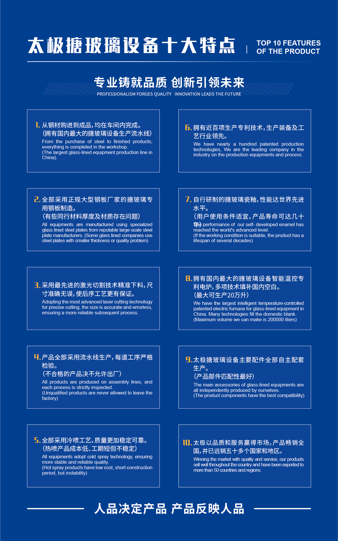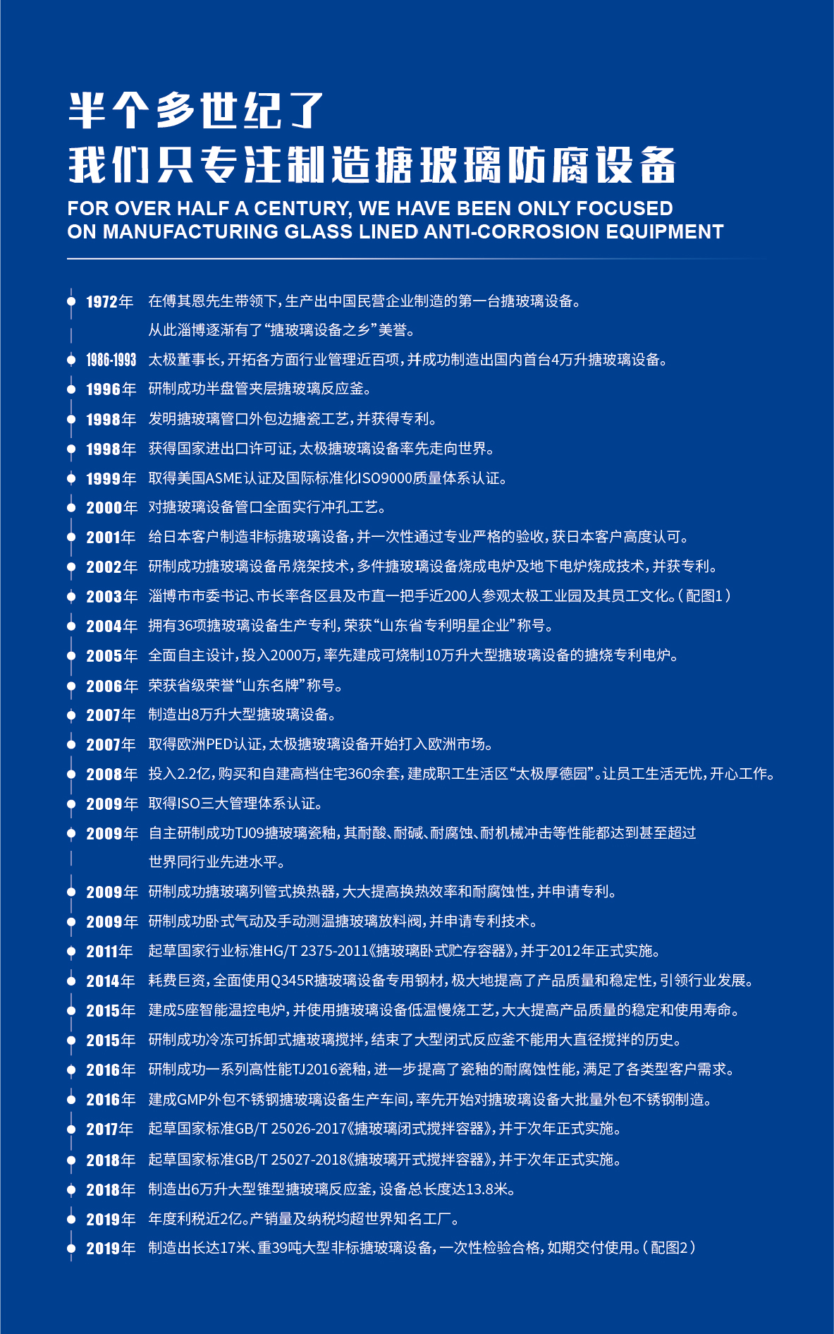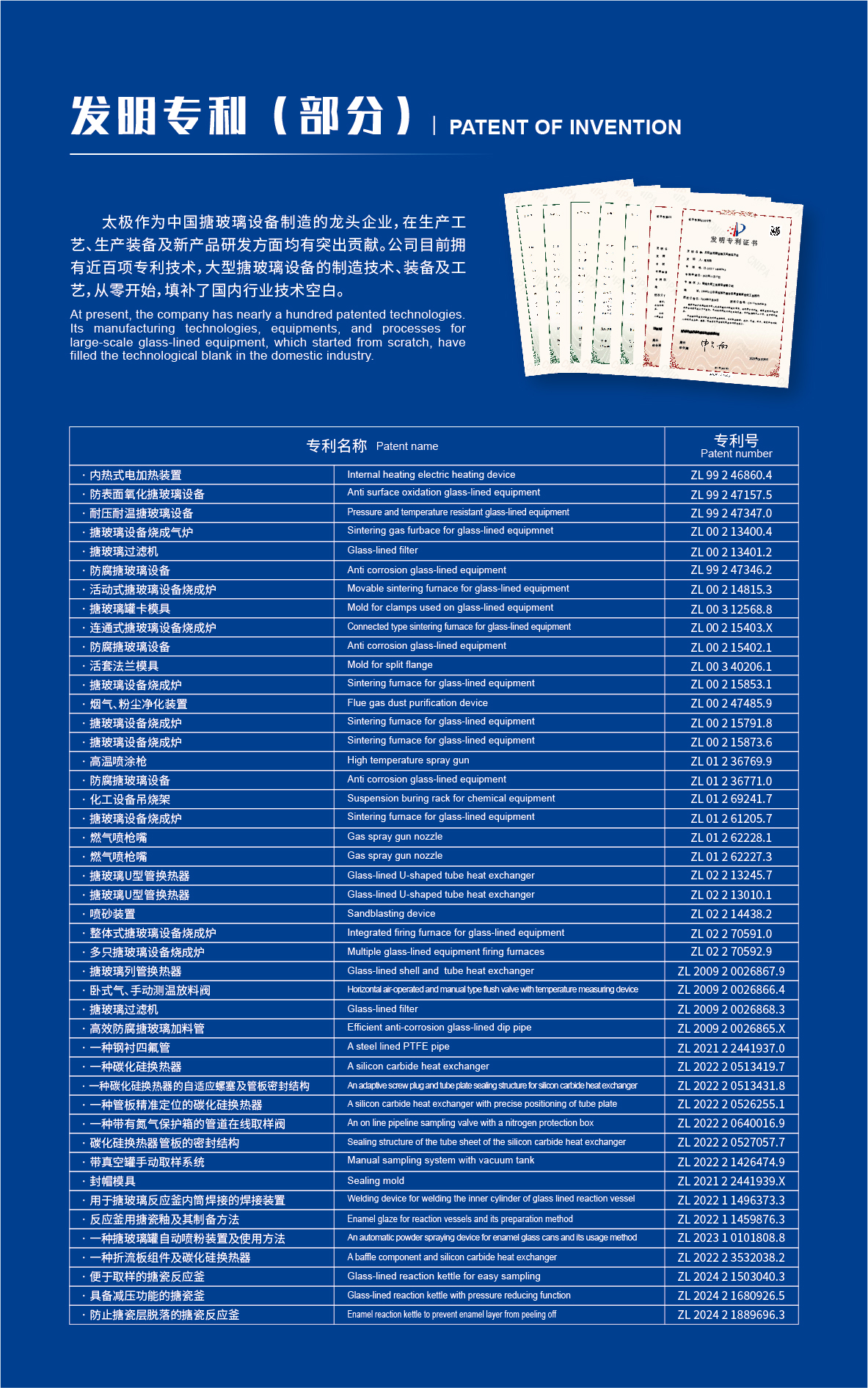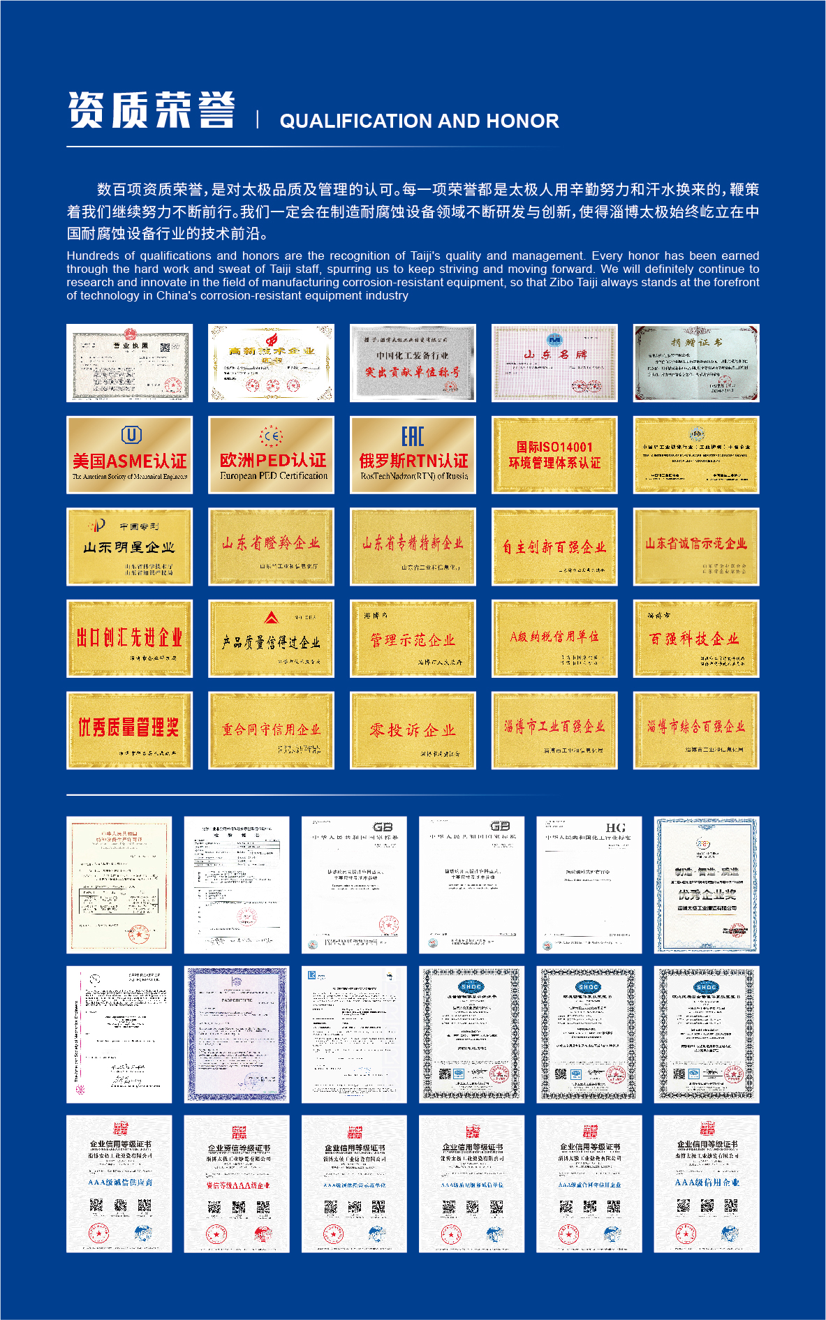 淄博太極在中國(guó)搪玻璃設(shè)備制造行業(yè)中首家通過(guò)ISO90001質(zhì)量體系認(rèn)證,并擁有美國(guó)ASME認(rèn)證、歐洲PED認(rèn)證以及國(guó)家部門(mén)頒發(fā)的搪玻璃制造許可證、進(jìn)出口許可證和百余項(xiàng)榮譽(yù)證以及三十六項(xiàng)專(zhuān)利等。